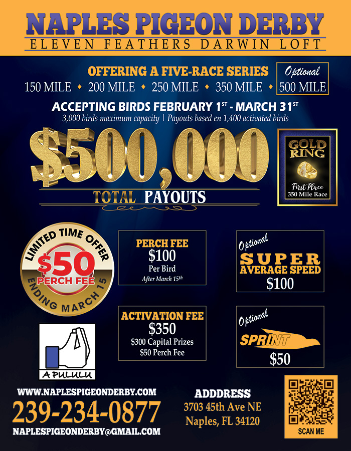 Naples Pigeon Derby is a race designed for those pigeon fanciers wishing to test their birds at a high level of competition.